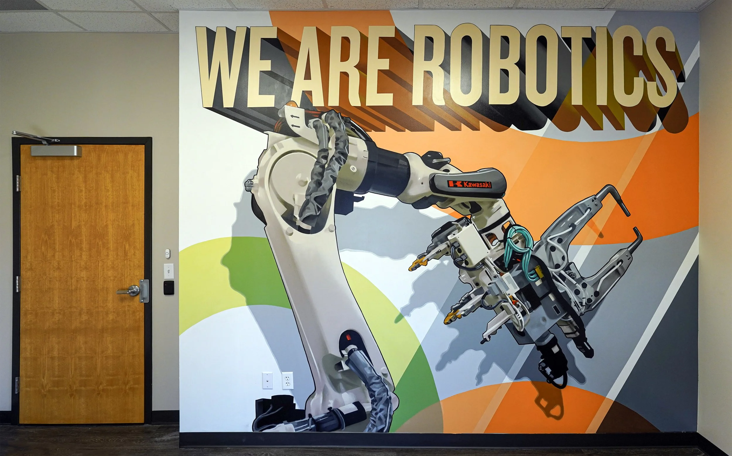 OSRS was contacted by Kawasaki Robotics USA to install an eye catching office mural in the lobby of the Louisville location. The mural showcases Kawasaki’s flagship robot along with their brand tagline and colors. We got the chance to showcase the wide range of our collective’s abilities: dimensional type, realistic painting, and eye pleasing geometric shapes.