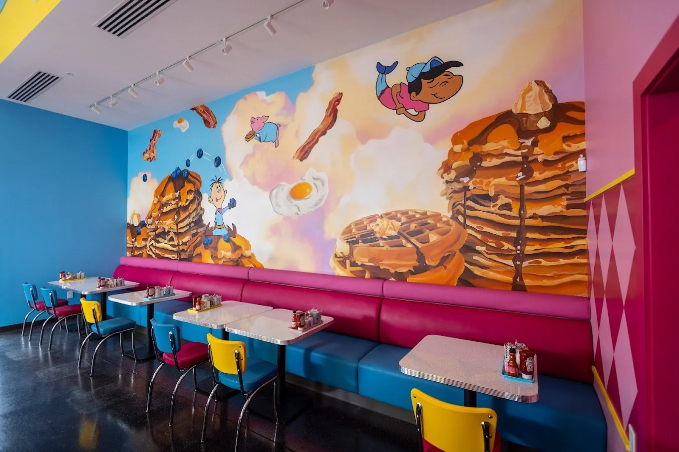 Sugar n’ Spice has been delighting the Cincinnati area with their breakfast food since 1941. The diner’s original location featured some awesome hand painted murals of breakfast food, and cartoon characters - So when SNS started expanding we jumped on the opportunity to create some new, exciting breakfast murals. We worked closely with the client and interior designers from Platte, to create the art. We painted the OTR location first in 2020, and then Blue Ash, Ohio in 2022.