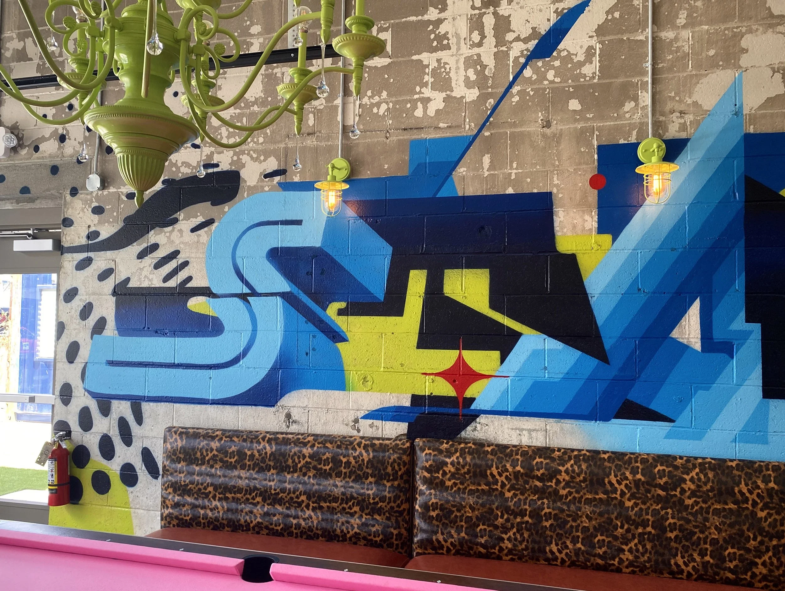 We were excited at the chance to create some elevated graffiti on a raw surface in NKY. This old mechanics garage was getting converted into a new posh bar & restaurant, and the interior designer hit us up for a mural in the pool room. They wanted us to stay authentic to our background, and honor the spaces history as a service garage. So this colorful mashup of graffiti and design is what unfolded.